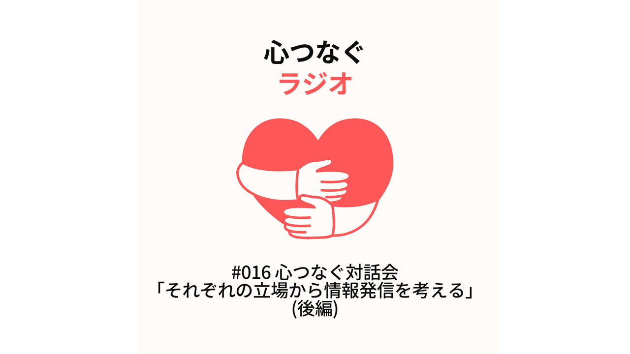 第16回は、7/25に開催した「心つなぐ対話会」でのトピックスをピックアップして、事務局メンバーがお話ししています。今回のテーマは前回に引き続き「それぞれの立場から情報発信を考える」の後編です。